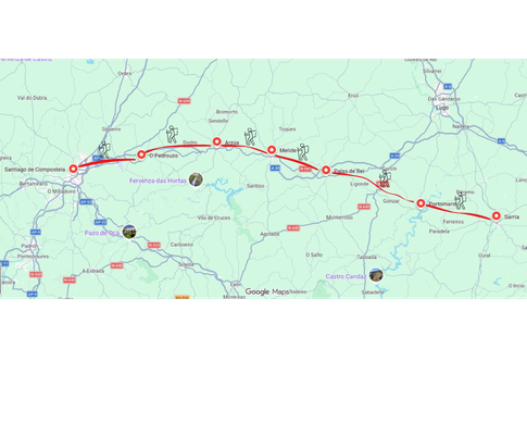 Vandringen fortsätter genom det lugna galiciska landskapet med små gårdar och gröna kullar. I Palas de Rei möts flera pilgrimsleder. Här ansluter Camino Primitivo, den ursprungliga leden från Asturiens norra kust.